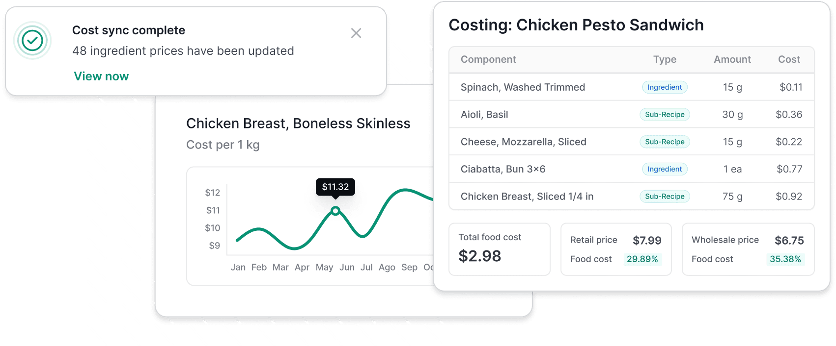 Connect directly to major vendors to see price changes reflected instantly across all recipes, with real-time alerts showing exactly how fluctuations affect your bottom line.