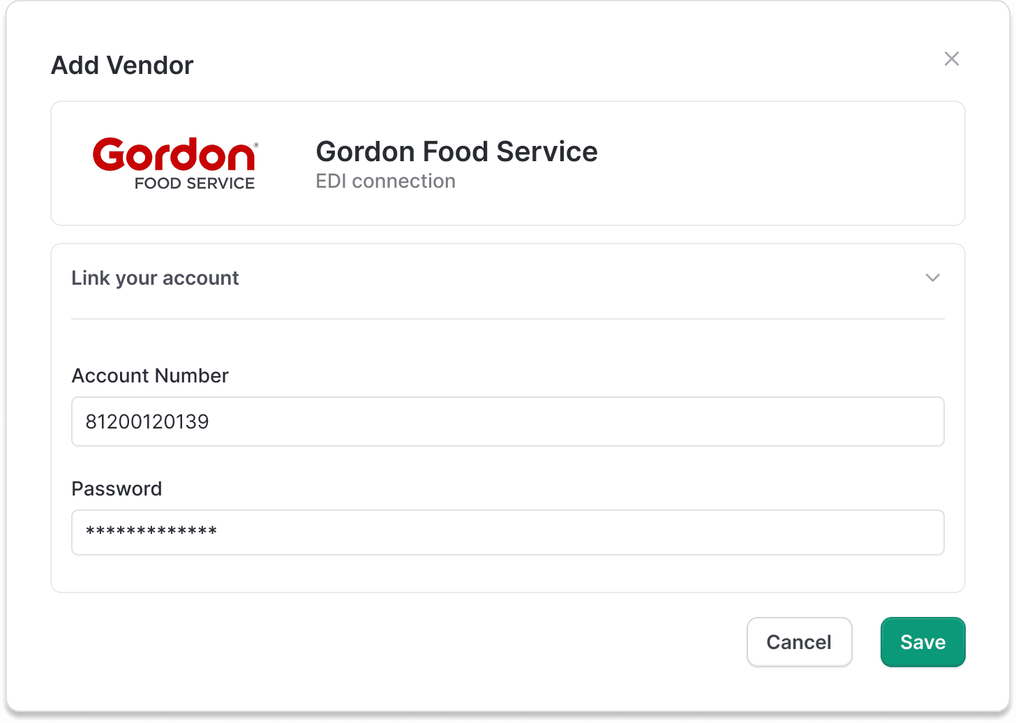 Sync pricing and availability from major distributors like Sysco and Gordon Food Service to eliminate manual invoice entry and keep costs current.